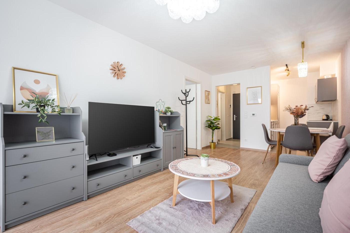 One-Bedroom Apartment. This air-conditioned apartment comes with 1 living room, 1 separate bedroom and 1 bathroom with a bath or a shower. The well-fitted kitchen has a stovetop, a refrigerator, a dishwasher and an oven. Boasting a balcony with city views, this apartment also features a washing machine and a TV. The unit has 2 beds.