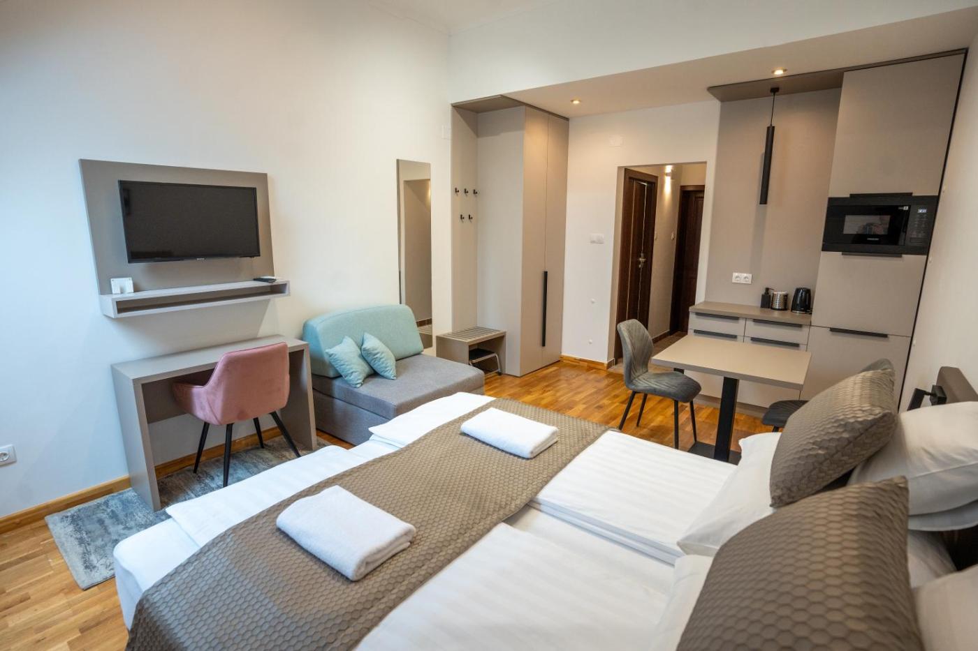 Studio Apartment. Boasting a private entrance, this air-conditioned apartment features 1 bedroom and 1 bathroom with a shower. The well-fitted kitchenette has a stovetop, a refrigerator, kitchenware and a microwave. The apartment features a flat-screen TV with cable channels, a dining area, a wardrobe, an electric kettle as well as city views. The unit has 2 beds. ;